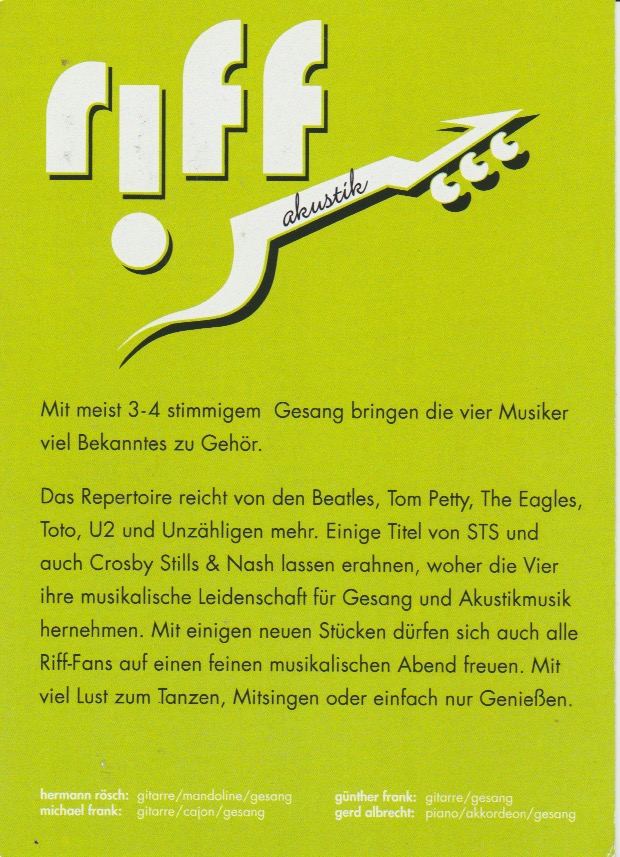 Das Repertoire reicht von den Beatles, Tom Petty, The Eagles, Toto, U2 und Unzähligen mehr. Einige Titel von STS und Crosby Stills & Nash lassen erahnen, woherdie Vier ihre musikalische Leidenschaft für Gesang und Akustikmusik hernehmen. Mit einigen neuen Stücken dürfen sich auch alle Riff-Fans auf einen feinen musikalischen Abend freuen.